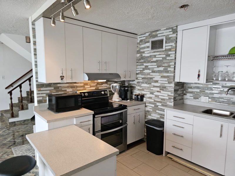 Pisos de mármol, cocina equipada y lavandería con lavadora-secadora combo. Amplio master con walk-in closet.