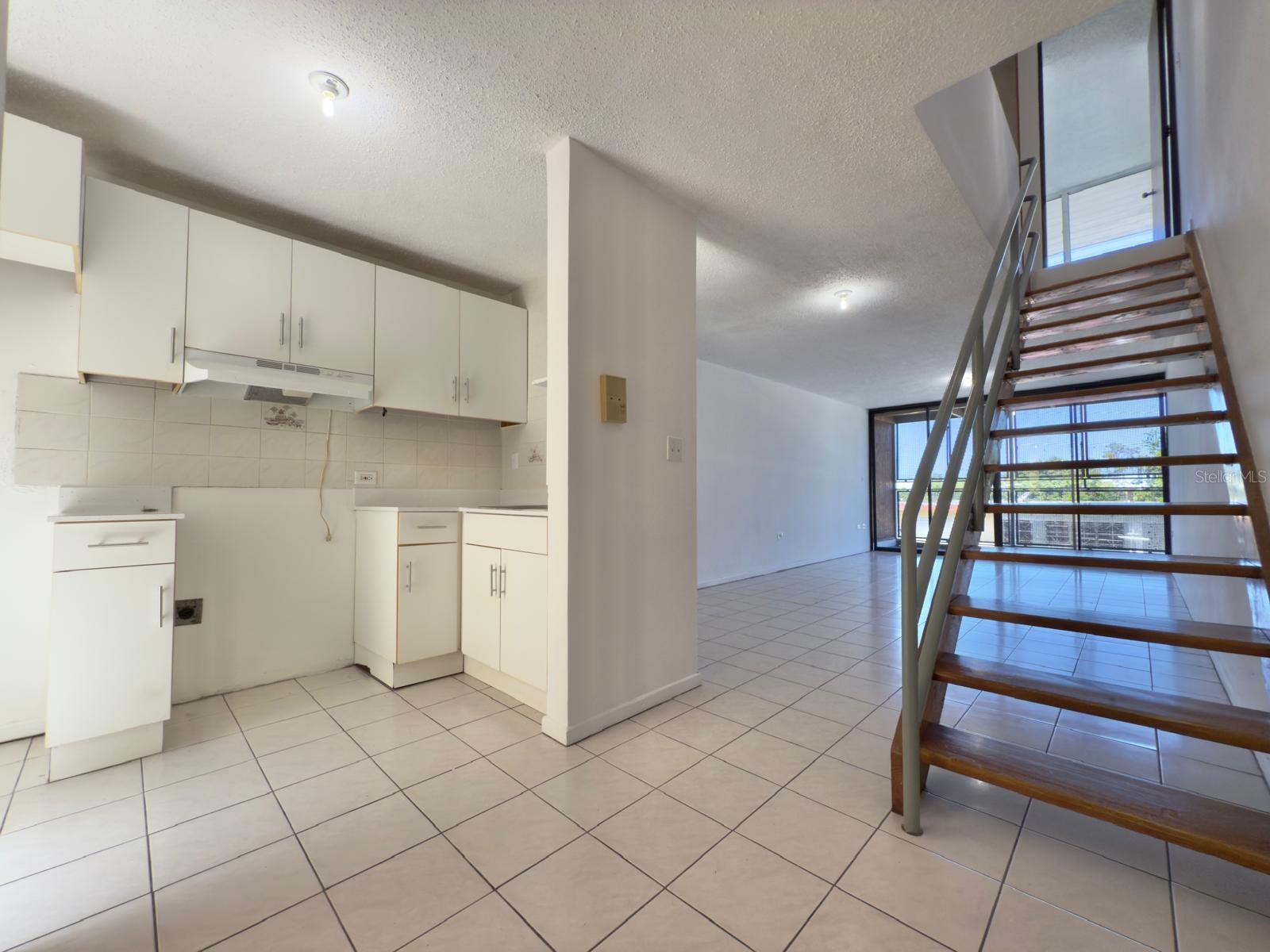 Two-level apartment with approximately 955 square feet (88.7 m²) of living space, located on the second floor of Reina de Carolina Condominium, centrally situated in the heart of Carolina downtown area. The property features a living-dining area open space, kitchen with cabinetry, linen closet with shelves, balcony (off the living room, overlooking the city and street) with sliding doors, and an outdoor terrace area uncovered at the entrance foyer with a half bathroom, all on the first level.