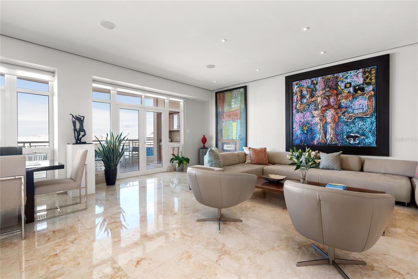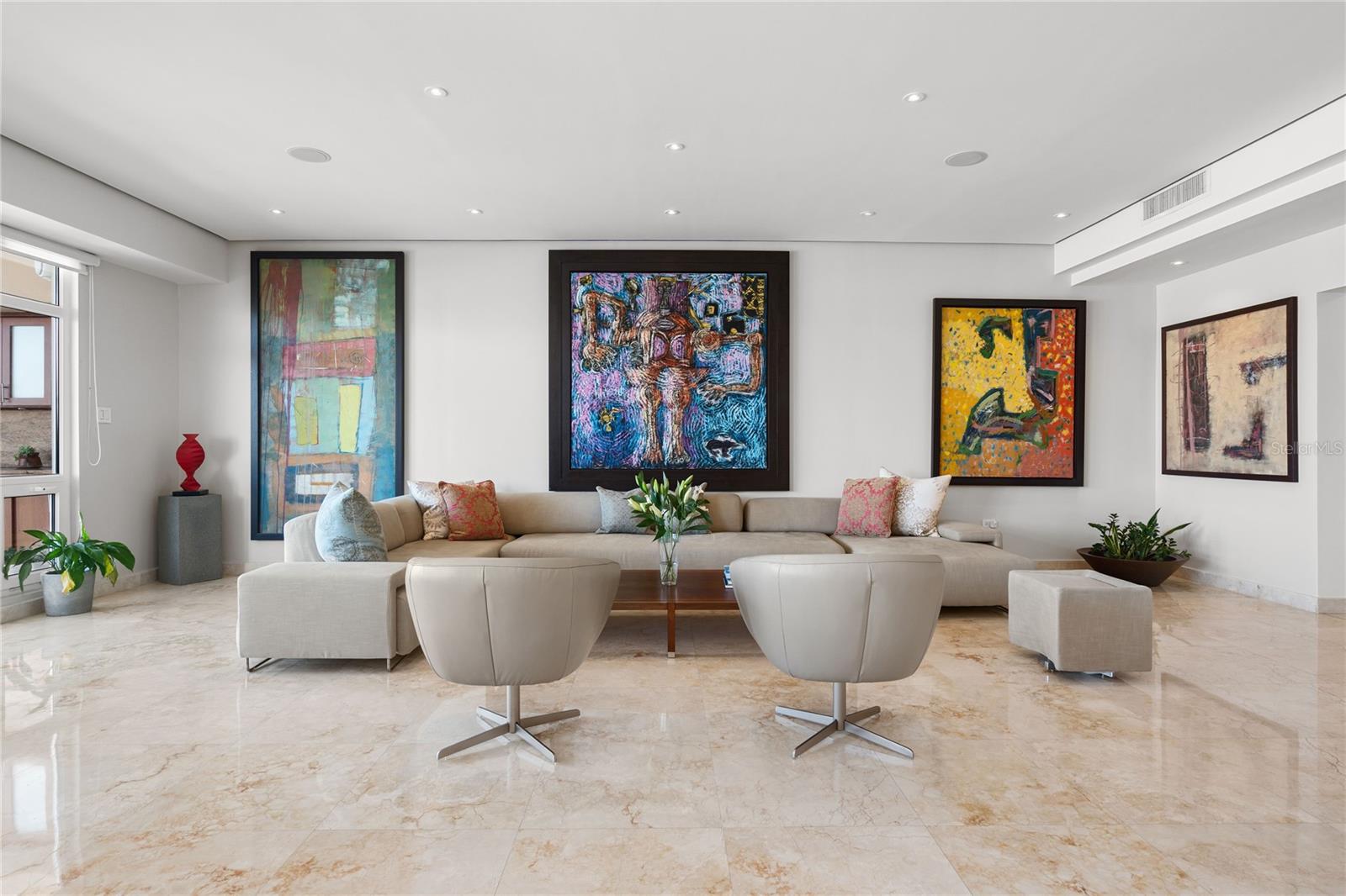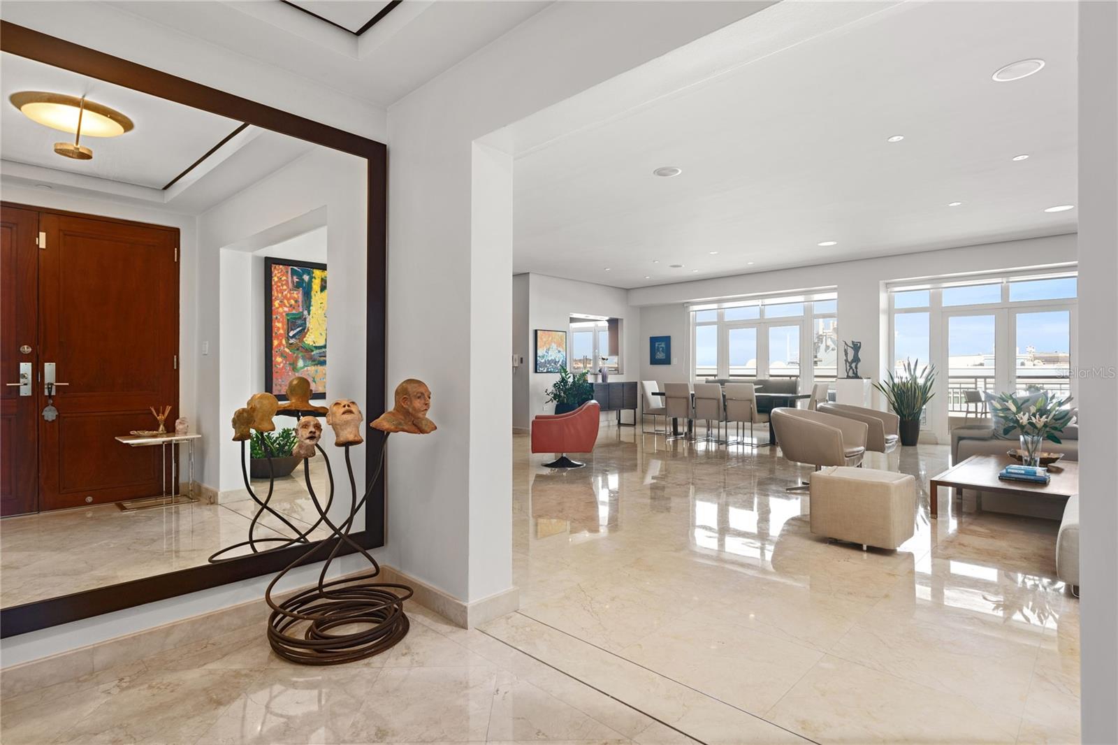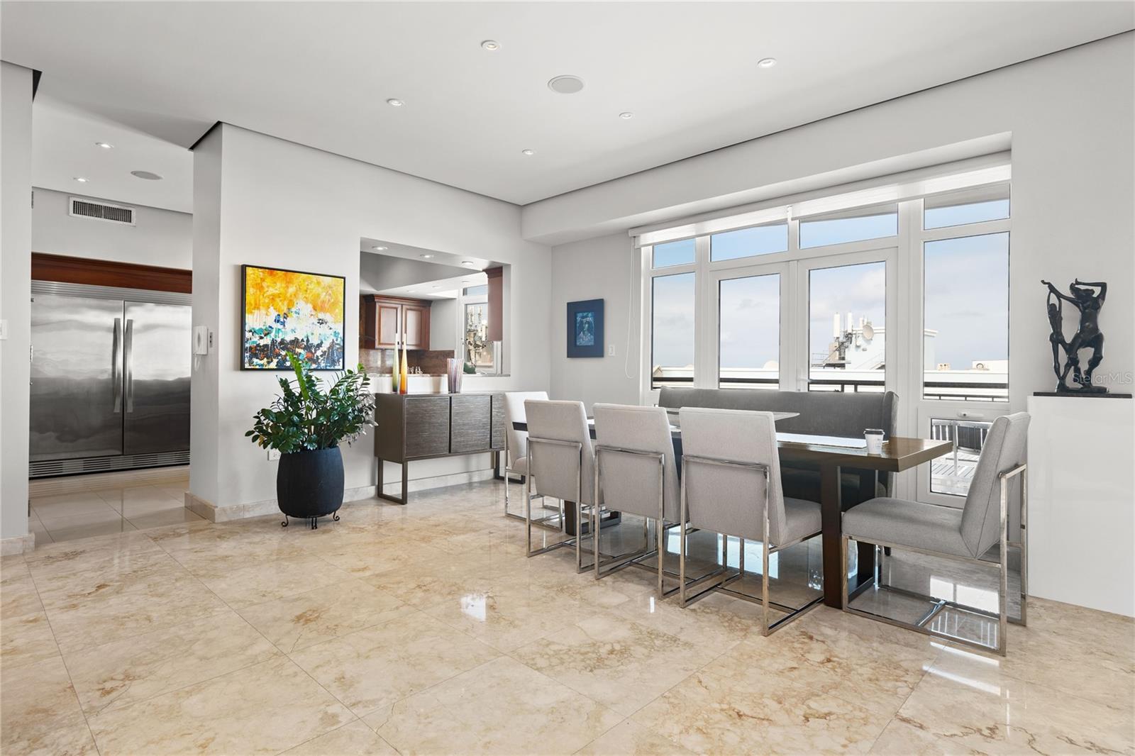 The grandeur of high ceilings enfolds you in an air of sophistication. High-quality Sienna-toned marble floors guide you through the foyer towards the grand living area, a space meticulously curated where every detail has been selected with discerning taste. This exclusive corner Penthouse boasts a magnificent northeastern exposure ensuring an abundance of natural light, bathing the interior in a soft glow that complements the lavish furnishings. Panoramic views of the San Juan Bay Harbor and the historic Old San Juan Cityscape serve as a living masterpiece, painting an ever-changing tableau that transcends ordinary living.