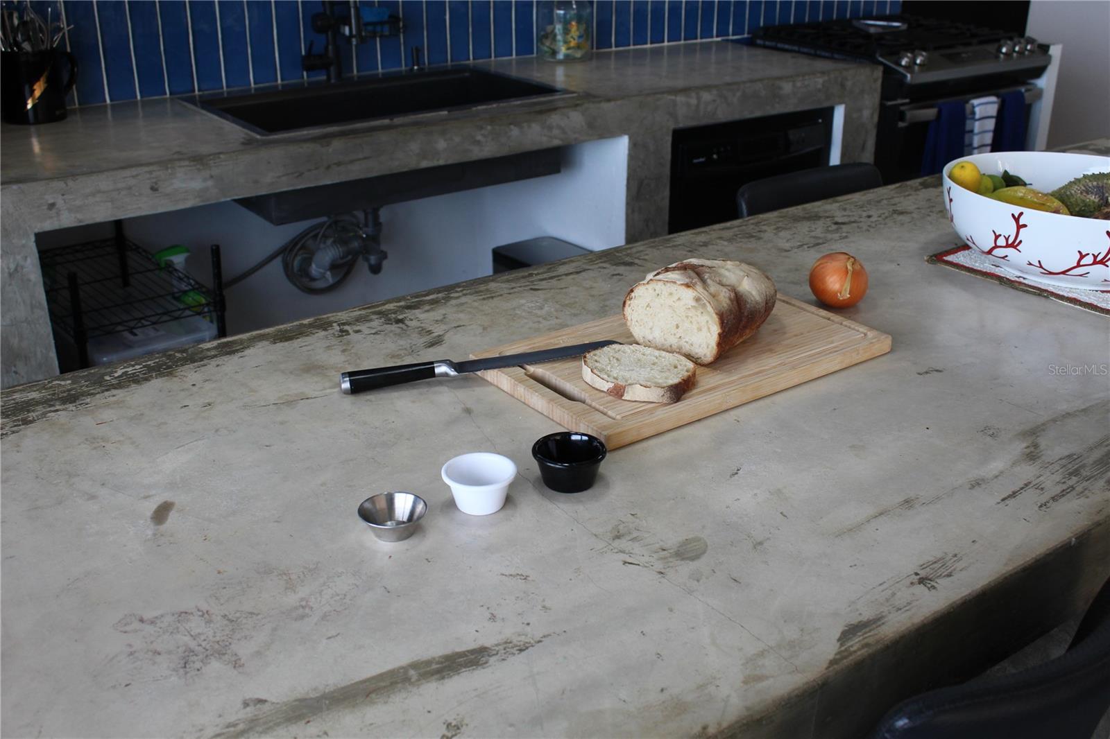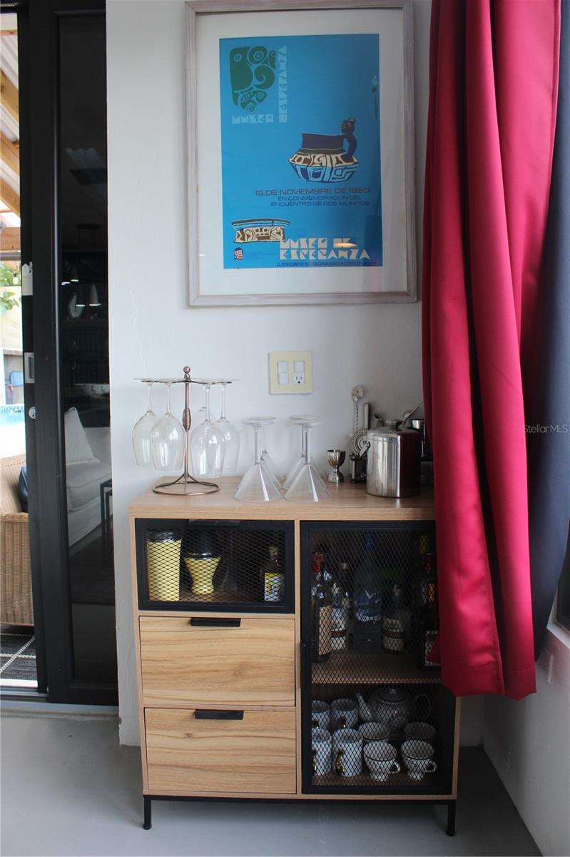 The focus of the interior of the home is a great room area encompassing a sizable kitchen, custom tile work with a 14-foot island, ideal for culinary enthusiasts, and a spacious living room divided into sitting and entertainment areas. An 18 foot-wide wall of glass provides uninterrupted views of the surrounding lush tropical island, and the every changing blue sea. There is a full bathroom on the main floor.