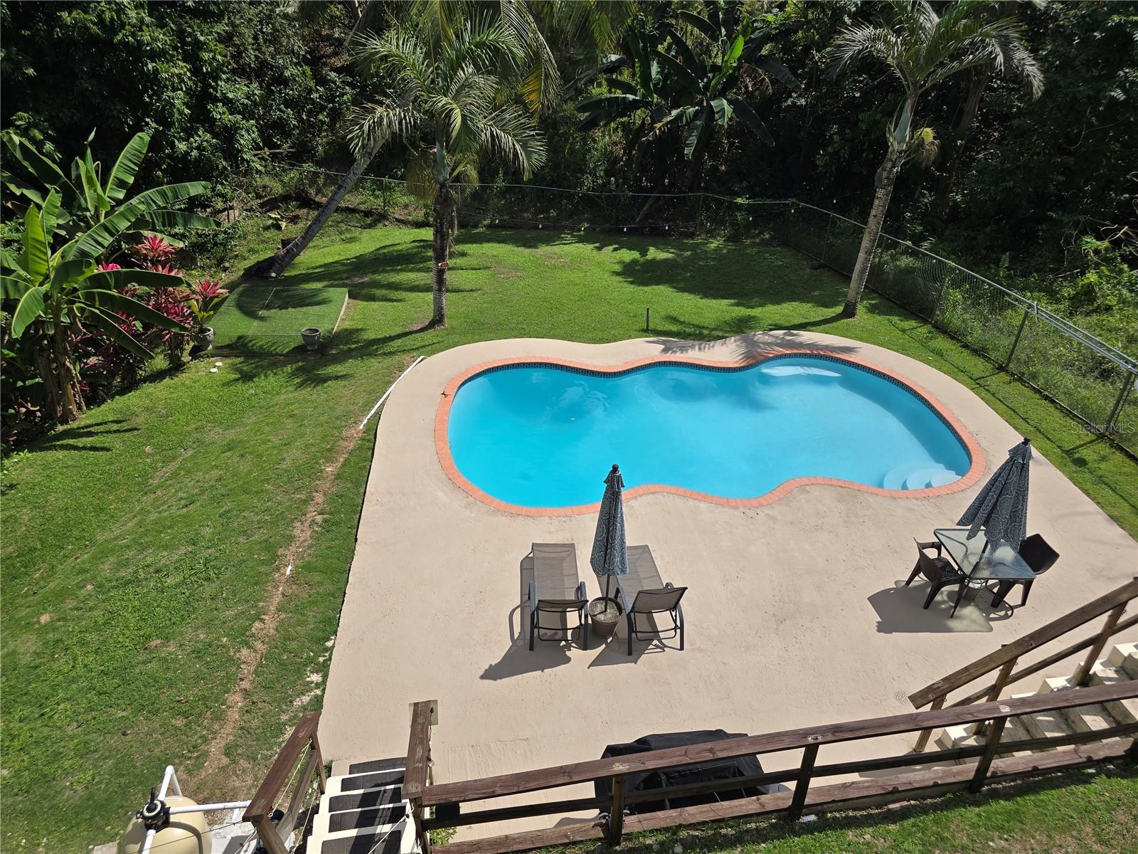 The property boasts an expansive yard, a two-car garage, solar panels, and a water reserve system. The backyard is designed for enjoyment, featuring a swimming pool and a generous outdoor space perfect for entertaining or relaxing.