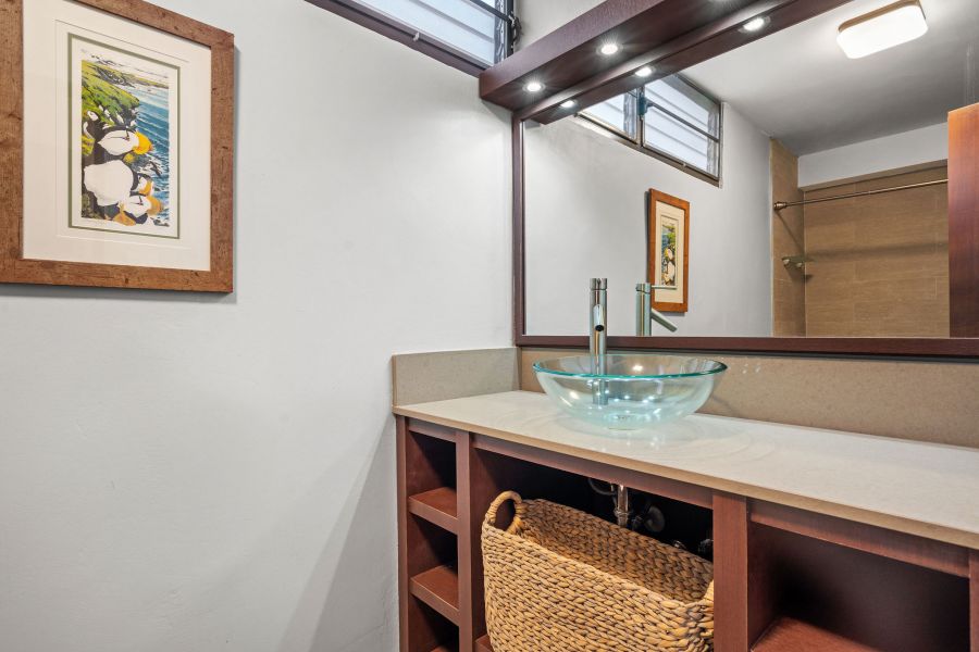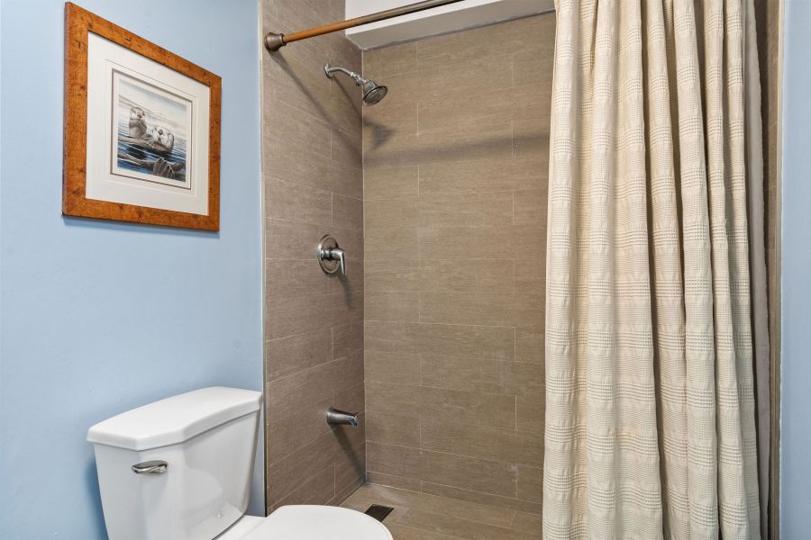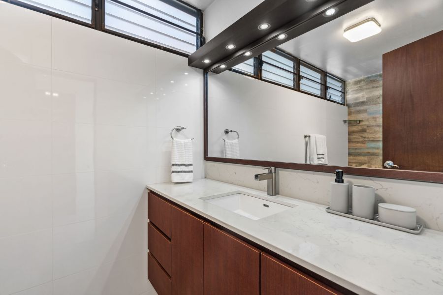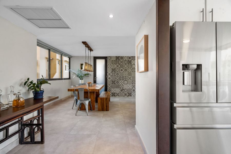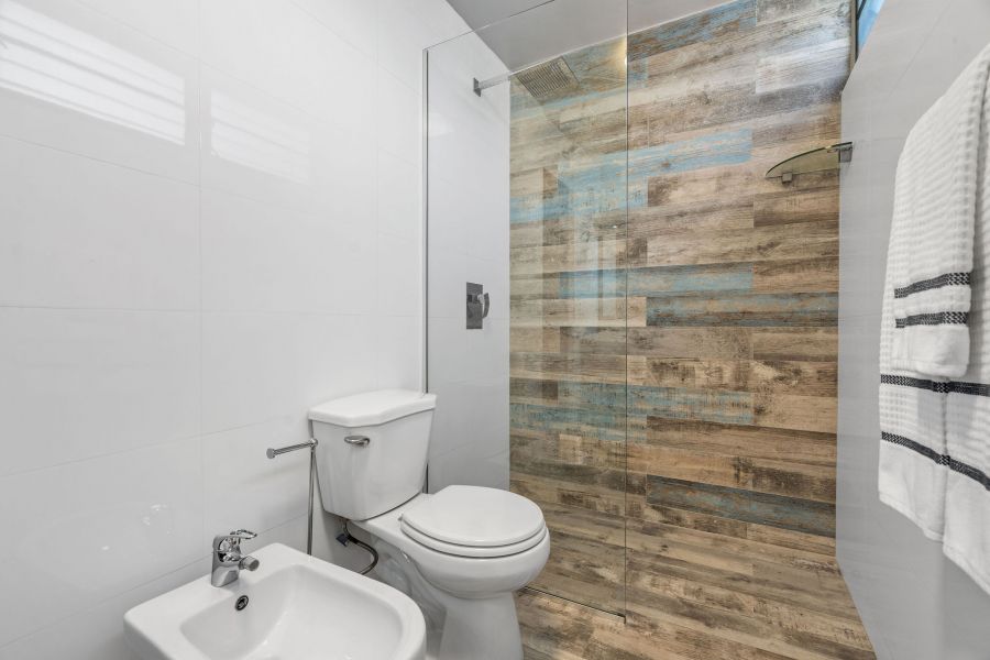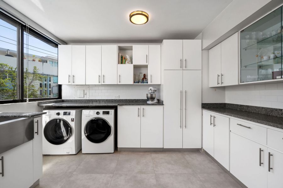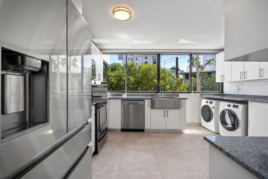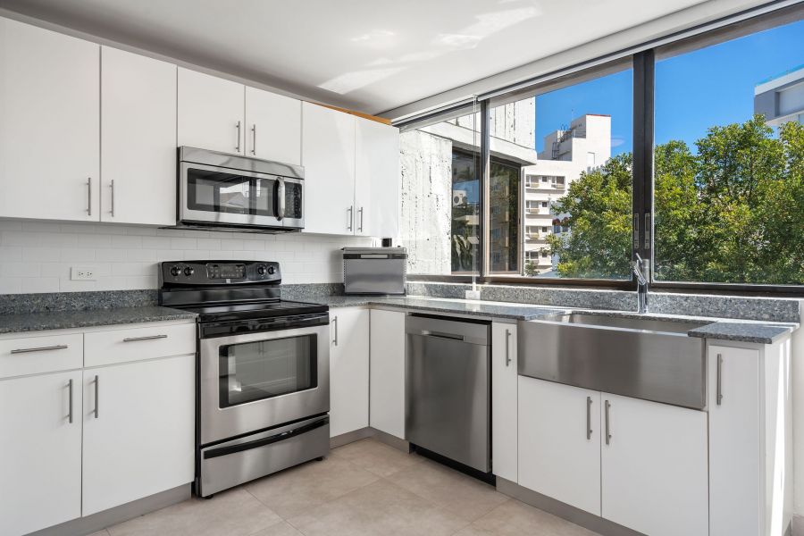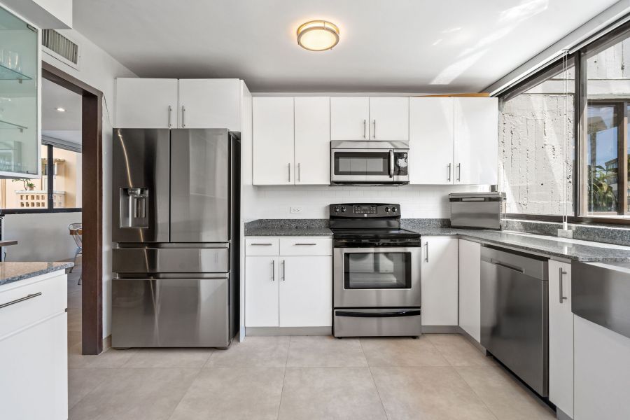 Inside, passed the entry hallway, the huge white kitchen with quartz countertops will be on your right. You’ll be surprised with the amount of cabinet storage this kitchen offers—because, let’s face it, there is never too much kitchen storage! Stainless steel kitchen appliances are all included: refrigerator, electric range with oven, microwave, wine cooler, dishwasher, and washer & dryer. Laundry is in the kitchen, which flows harmoniously with the vibe and color. The dining and living room are the perfect size, not too big, not too small, with natural light from every corner. Beautiful gray tiles have been upgraded all throughout and together with the decor and ceiling lamps, create a chic industrial vibe that is hard to find in Miramar. As you pass the door that leads to the bedrooms, there is an abundance of closet space in the hallway; all bathrooms have been completely remodeled with showers and sophisticated modern touches. Partial beach views from the bedrooms create a nice sense of serenity. The first two bedrooms are spacious and have closets with mirror doors, mini split a/c units, ceiling fans, and both can comfortably fit queen size beds. Continue down the hallway and you enter the Master Bedroom, a simple modern room with the same natural light found all throughout the apartment. The master closet has been thoughtfully customized with dual bars and drawers to maximize storage and provide function.