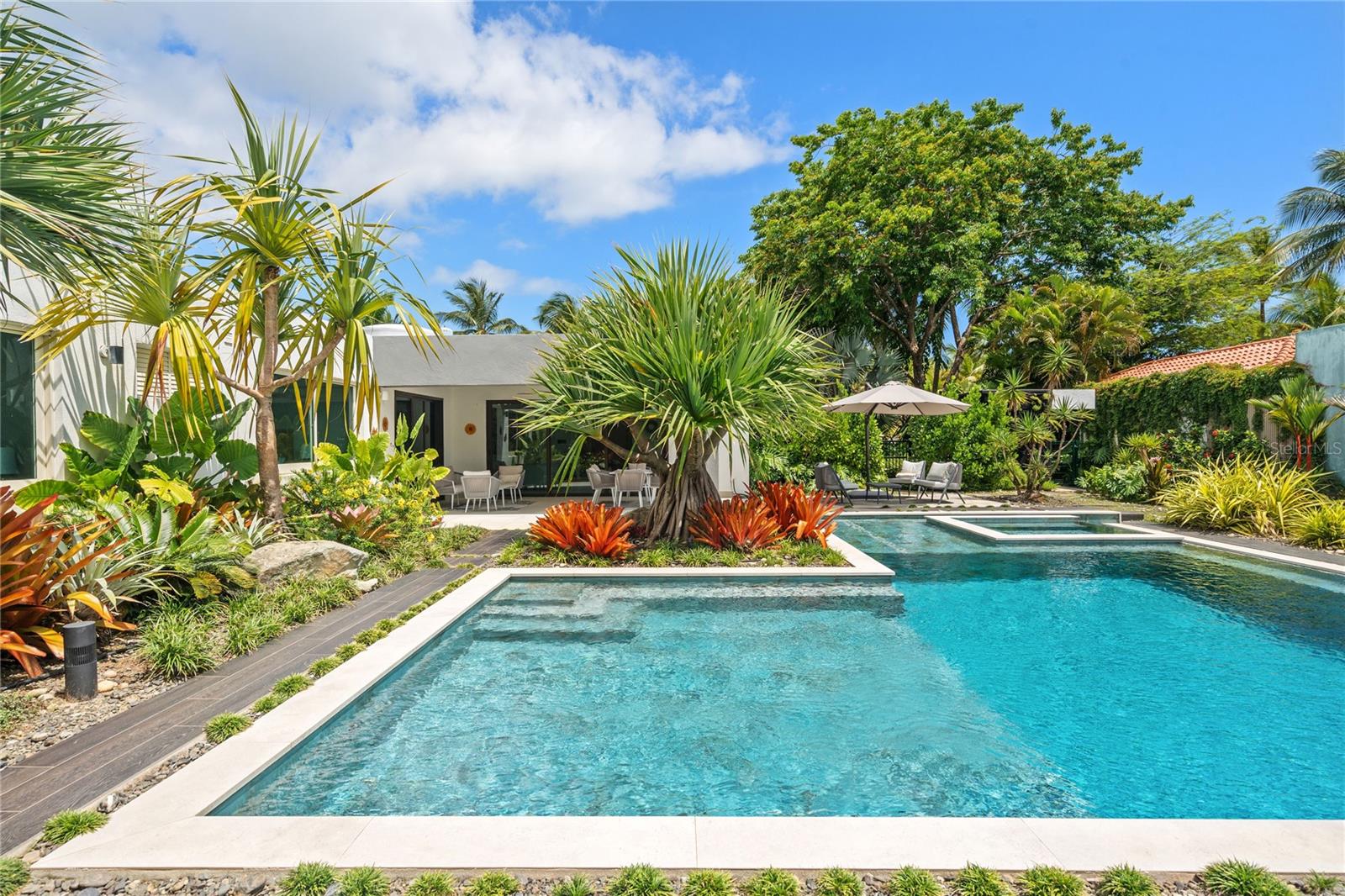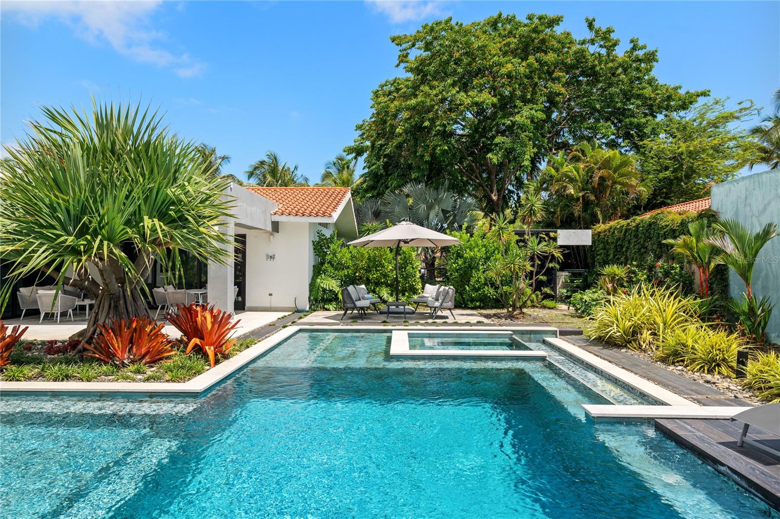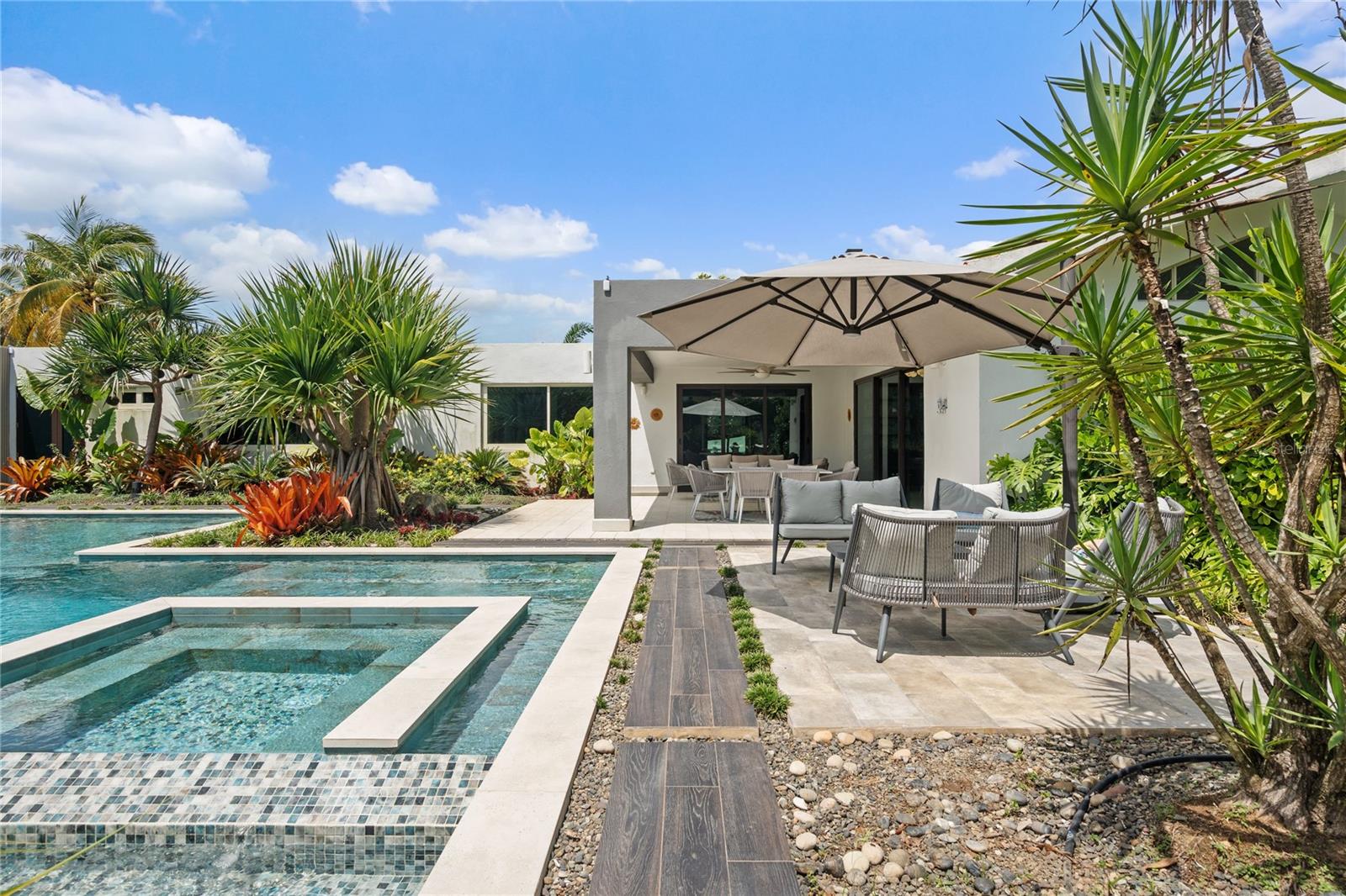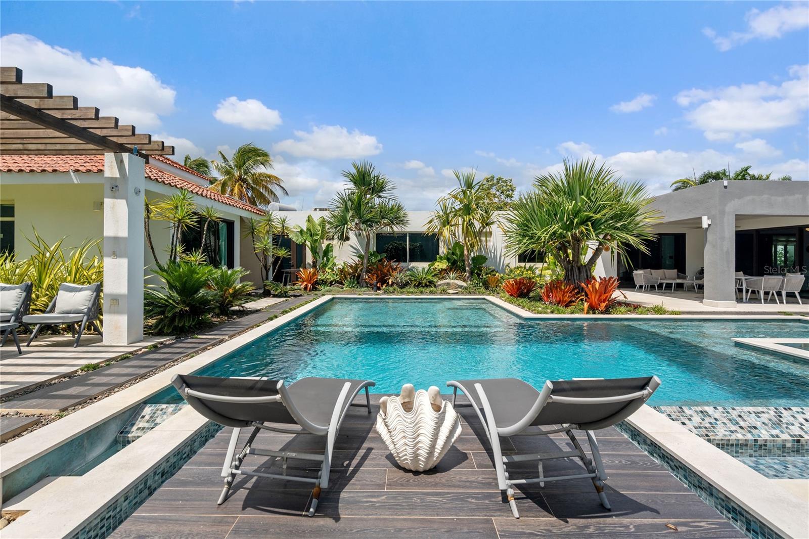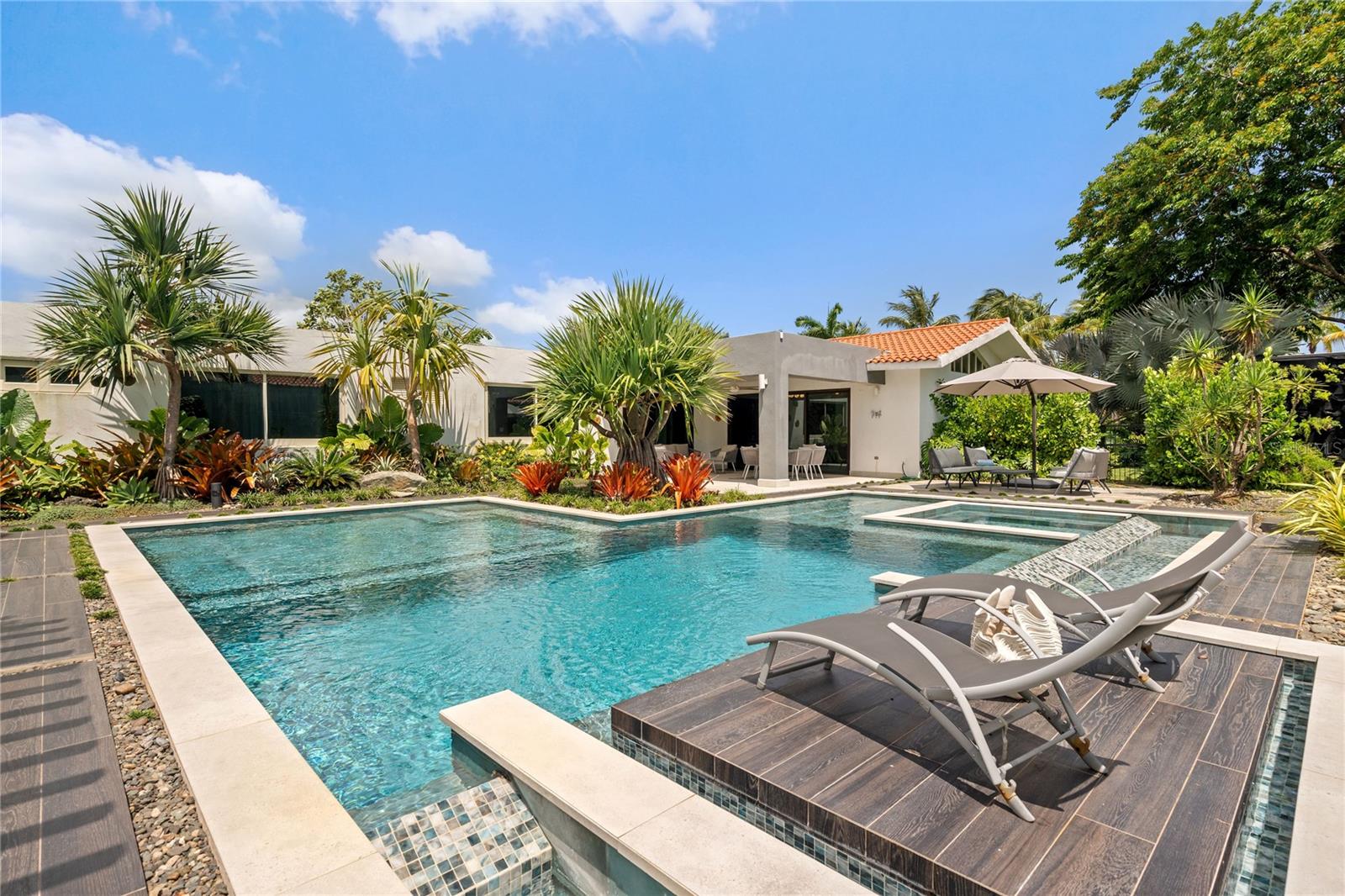 Set on a large 1,778 m² lot, the outdoor space is a true highlight. It includes a covered terrace, multiple seating areas, a pool, hot tub, outdoor shower, and outdoor bathroom, all surrounded by lush landscaping that creates a private, tropical oasis perfect for relaxing.