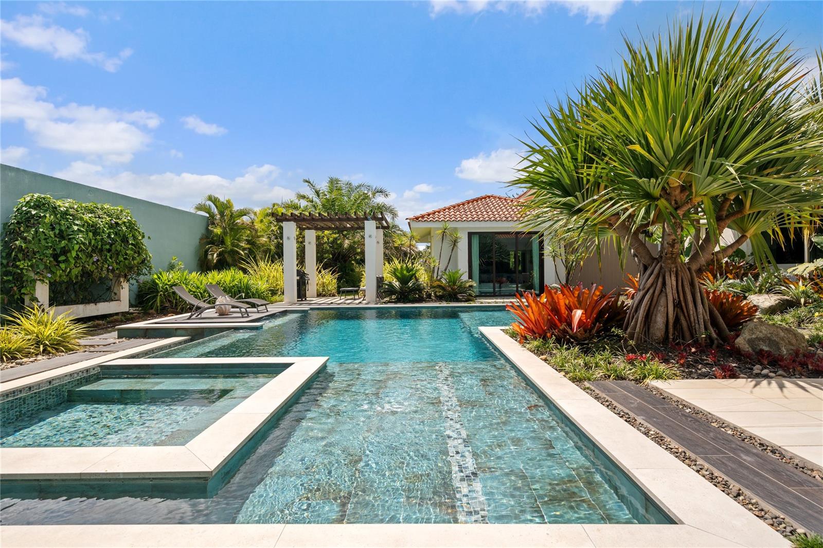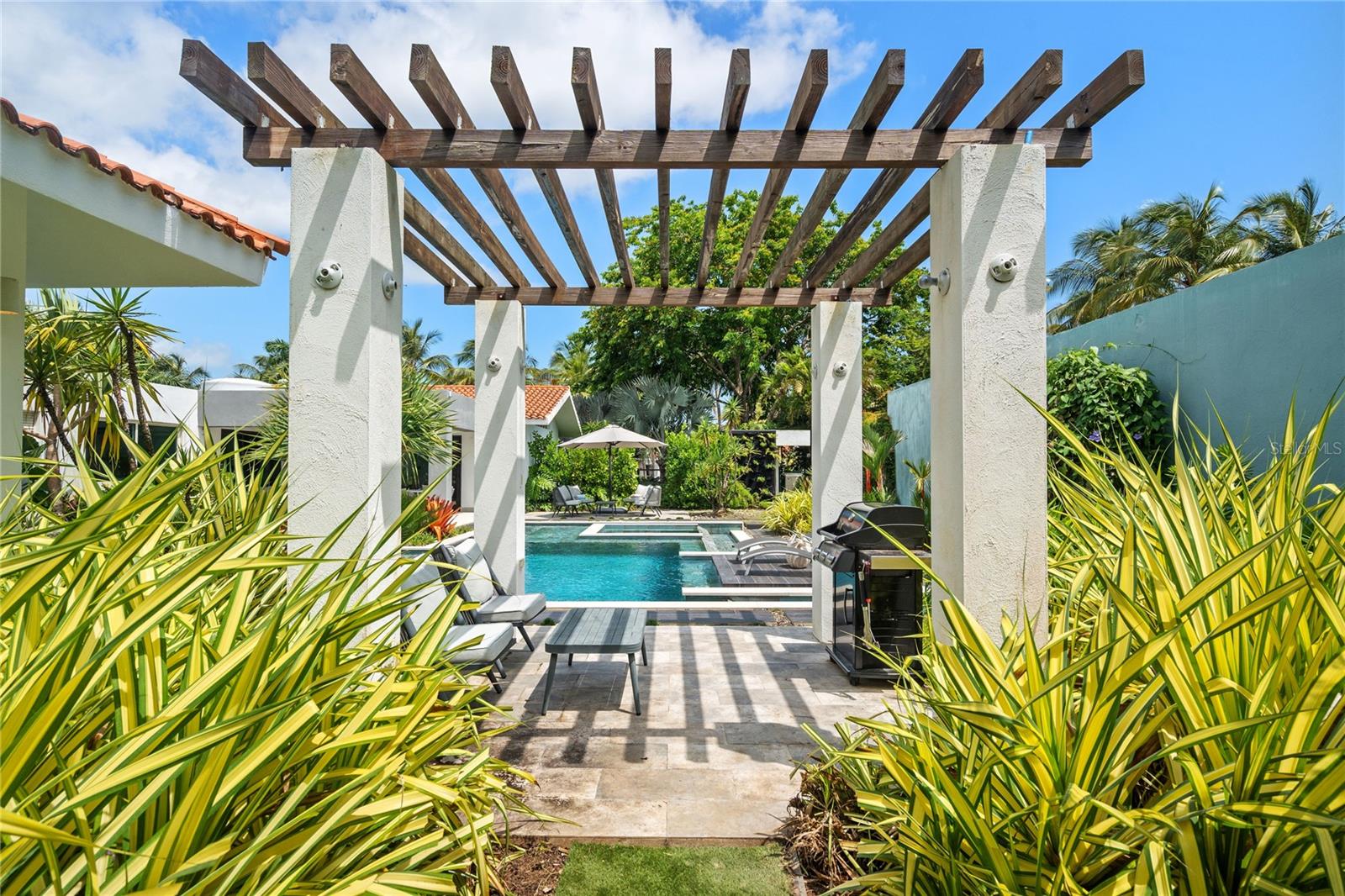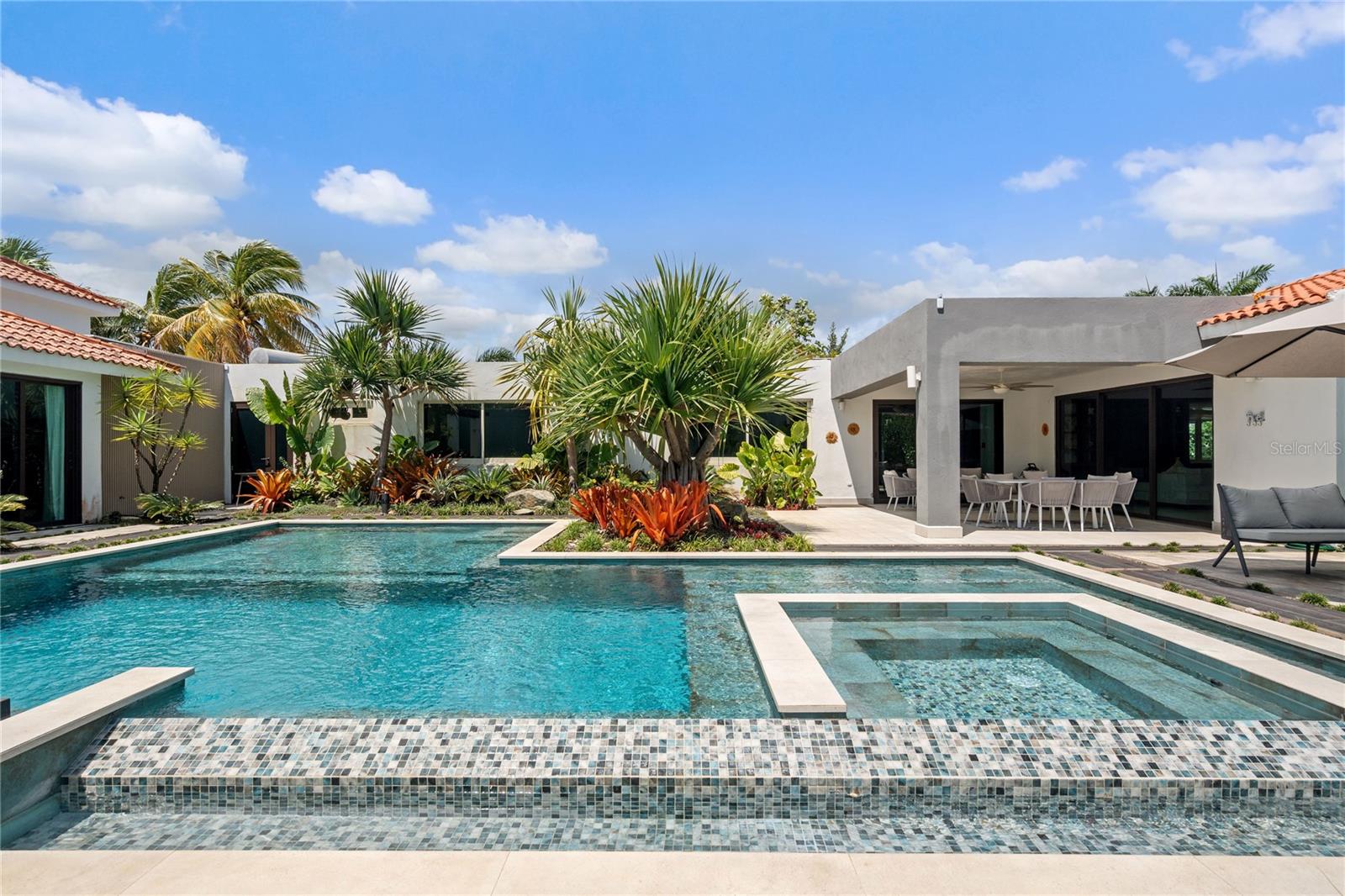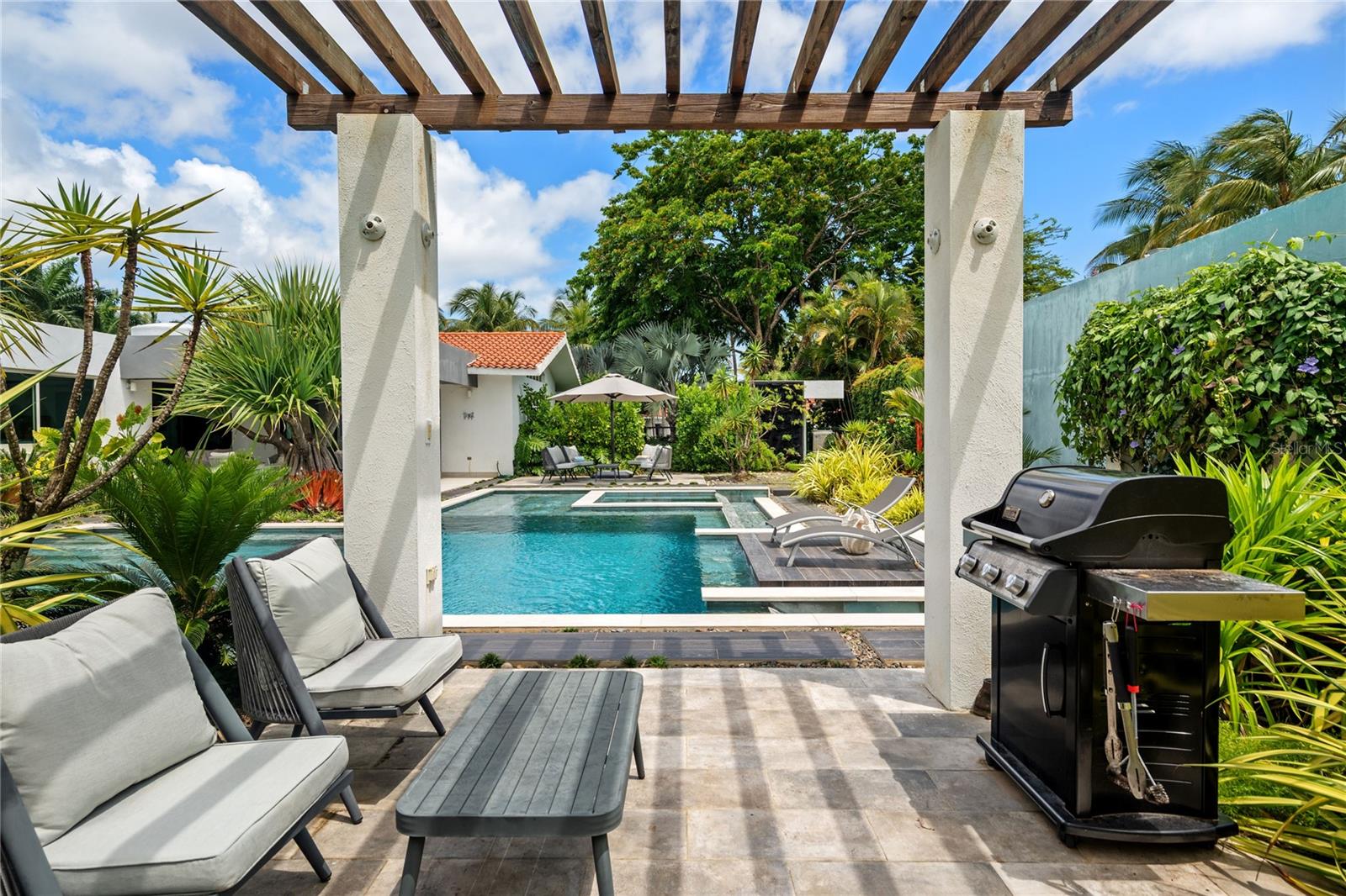 Set on a large 1,778 m² lot, the outdoor space is a true highlight. It includes a covered terrace, multiple seating areas, a pool, hot tub, outdoor shower, and outdoor bathroom, all surrounded by lush landscaping that creates a private, tropical oasis perfect for relaxing.