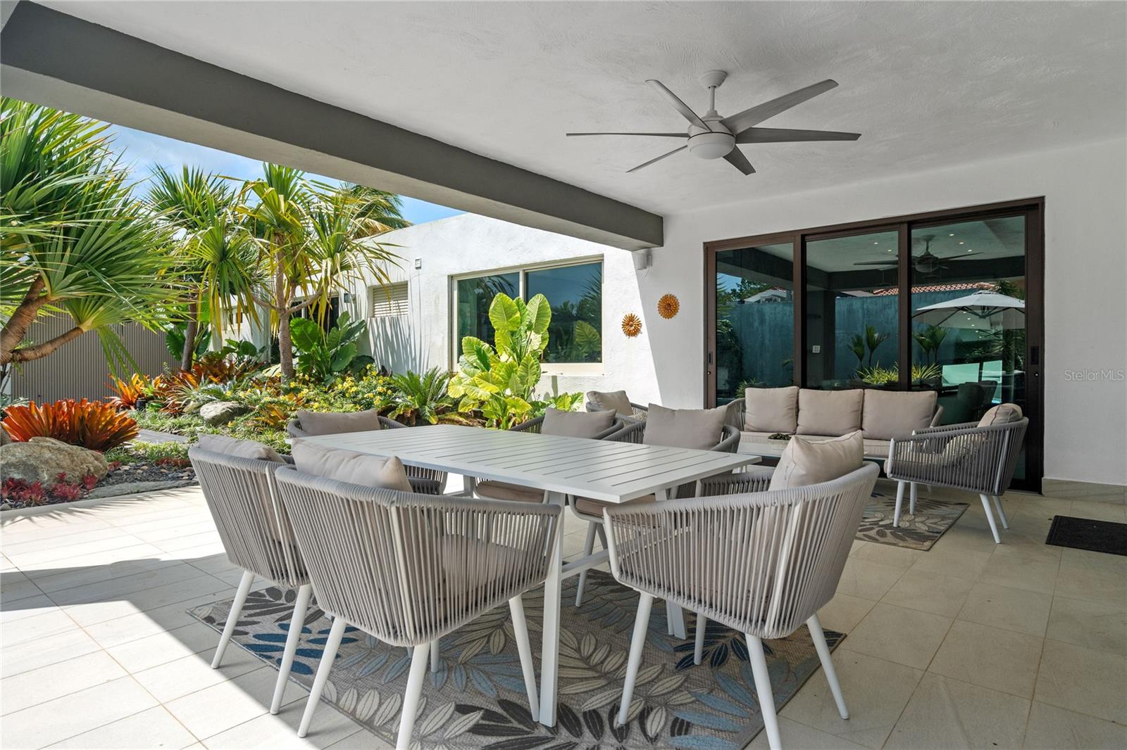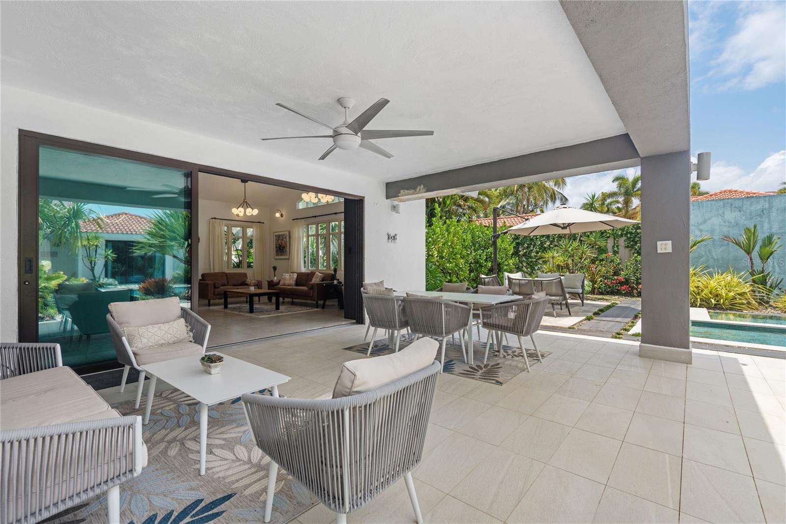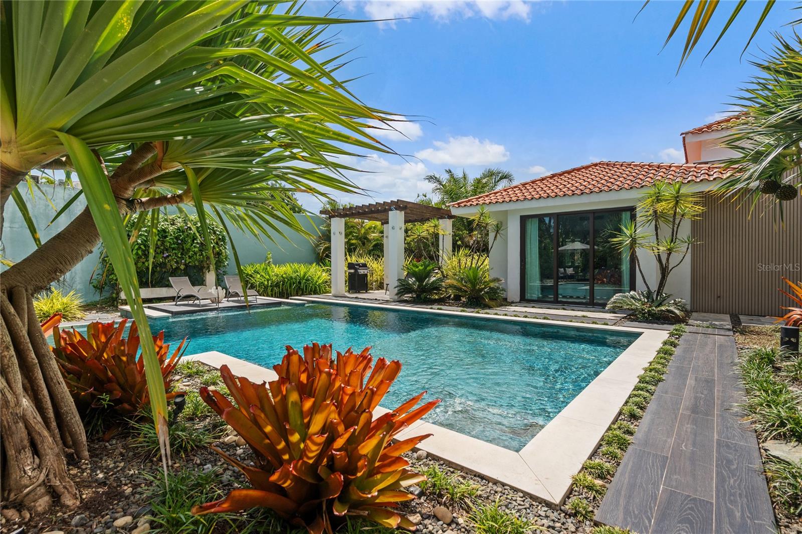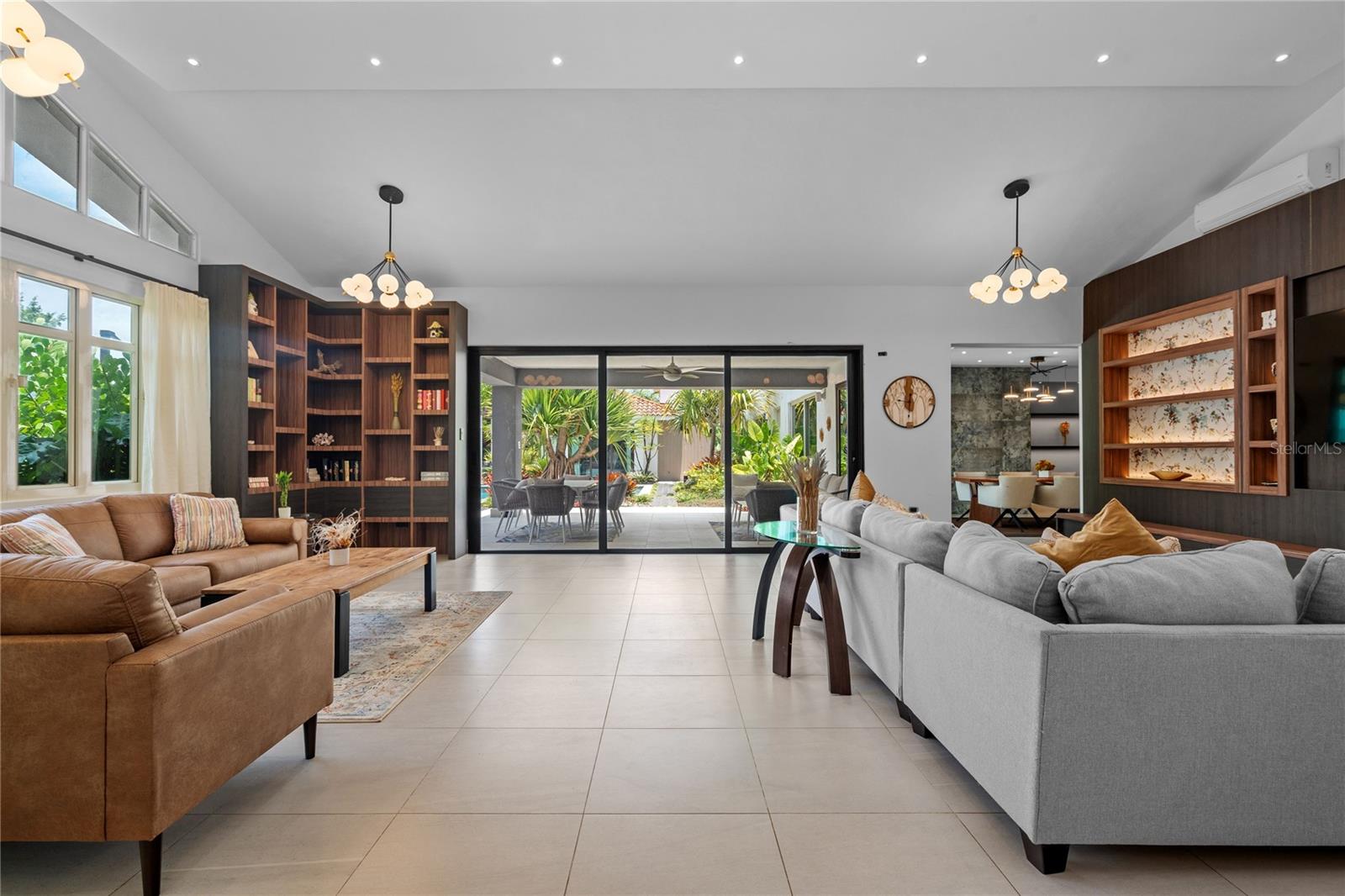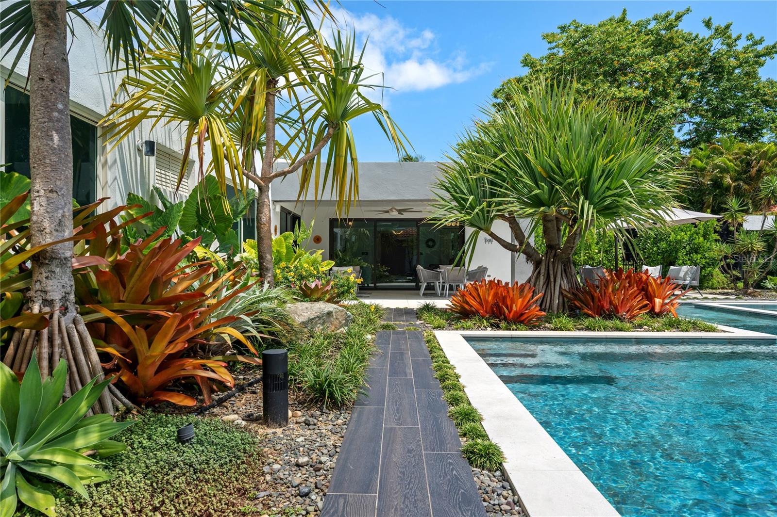 Set on a large 1,778 m² lot, the outdoor space is a true highlight. It includes a covered terrace, multiple seating areas, a pool, hot tub, outdoor shower, and outdoor bathroom, all surrounded by lush landscaping that creates a private, tropical oasis perfect for relaxing.