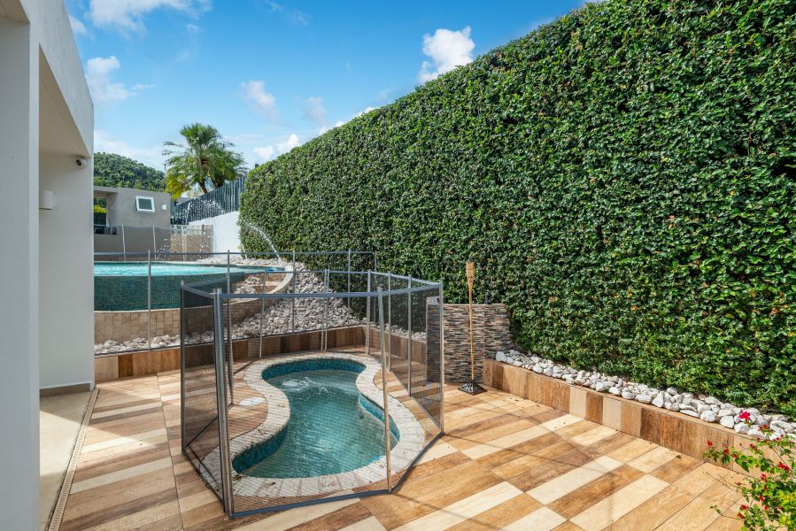 En el exterior, una piscina y jacuzzi con verja removible para la protección de niños, una terraza techada, marquesina con losas nuevas, pintura reciente, sellado de techo y mejoras estructurales reflejan un cuidado meticuloso.