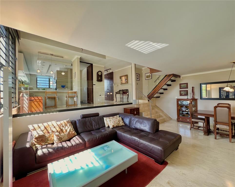 Beautiful sun-drenched architectural jewel, in the heart of residential Condado. This unique apartment is split in three different levels, allowing for ample spaces and privacy for each member of the family. The master bedroom rests on the second level and is adjacent to an area that can be used as an office/ den. The space has a private bathrooms and is also accesible from a separate staircase. The other two bedrooms are located on the third level. Luchetti Street is adorned by beautiful architecture and abundant green areas. This makes for a very enjoyable view, specially from the fully equipped kitchen. The apartment also has two balconies allowing for ideal cross ventilation and a peaceful secluded terrace.