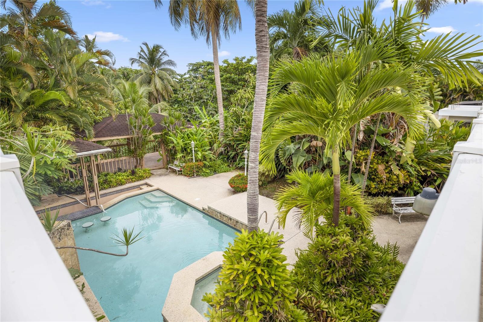 The backyard features a beautiful pool with a bar, jacuzzi, and a large gazebo. The house has a double carport and an additional space for a third car.