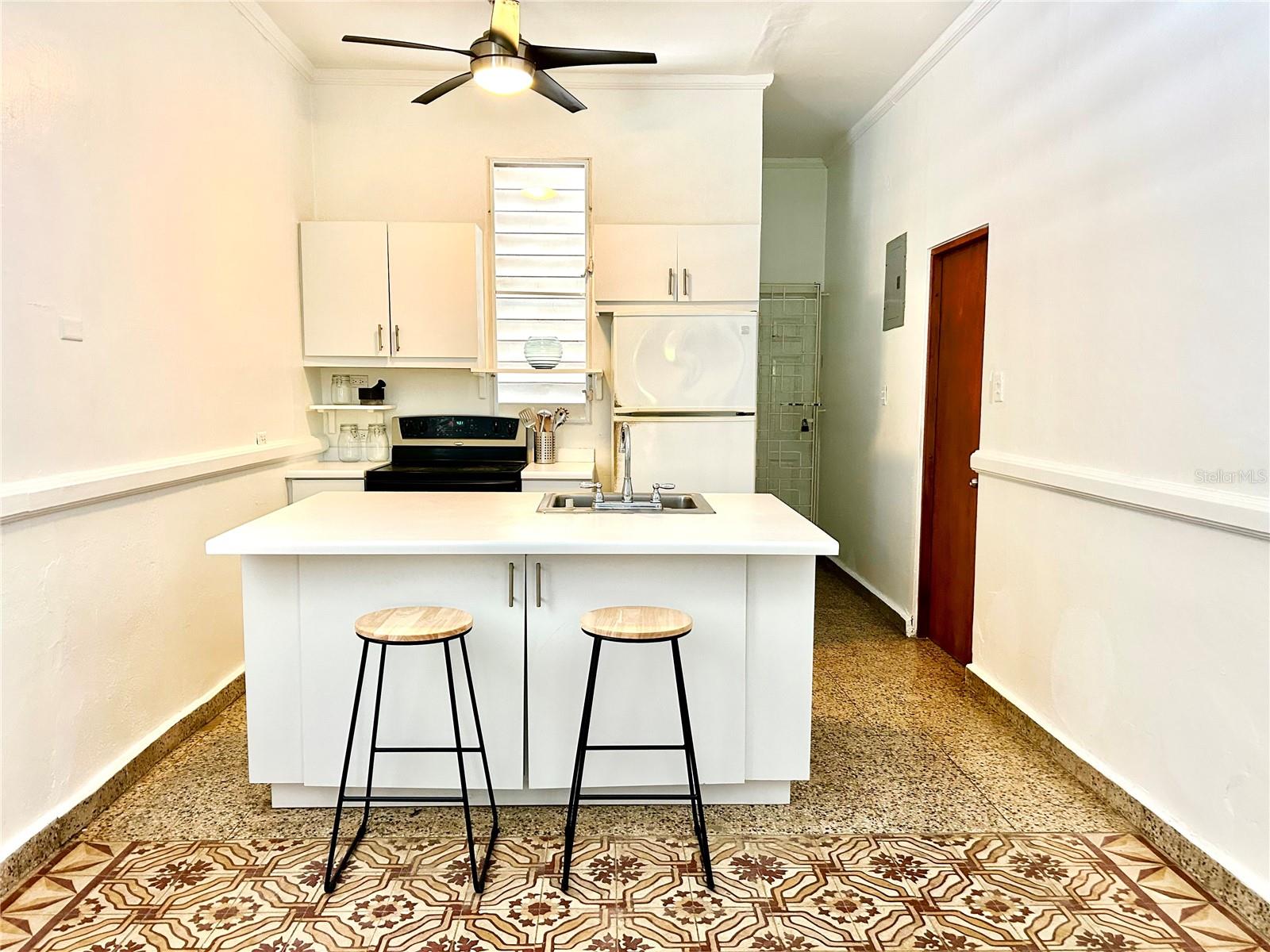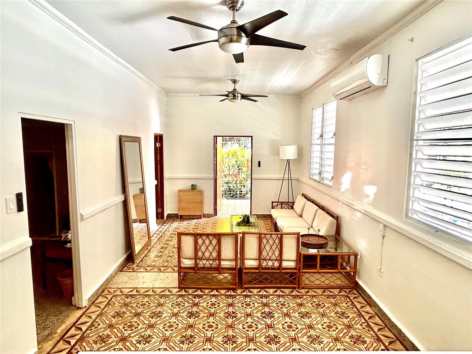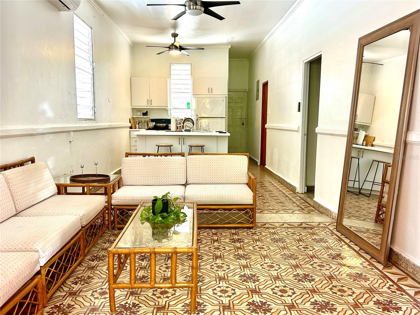 Mid century charm in the heart of Santurce! Distintive Spanish tiles, open layout along with high ceilings make this a unique gem. Carefully preserved with vintage accents, this quaint abode is very hard to come by. Fully furnished and equipped; two bedrooms + home office, one bathroom, balcony, bbq area with small yard, two parking spaces. Ideally located walking distance to the beach, Calle Loiza, supermarkets, gyms, yoga studios, restaurants and schools. This property has the advantage and convenience of having solar panels along with Tesla batteries + water cistern.