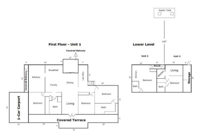 The property sits on 1 acre of land and features a total of 3 units across 2 levels. The main house is 1,944 square feet, with 3 bedrooms, 2 bathrooms, and a carport for 1 car. Behind and beneath the main house are two apartments, each with 1 bedroom, 1 bathroom, and a kitchen; one is 362 square feet and the other is 345 square feet. These two units require repairs.